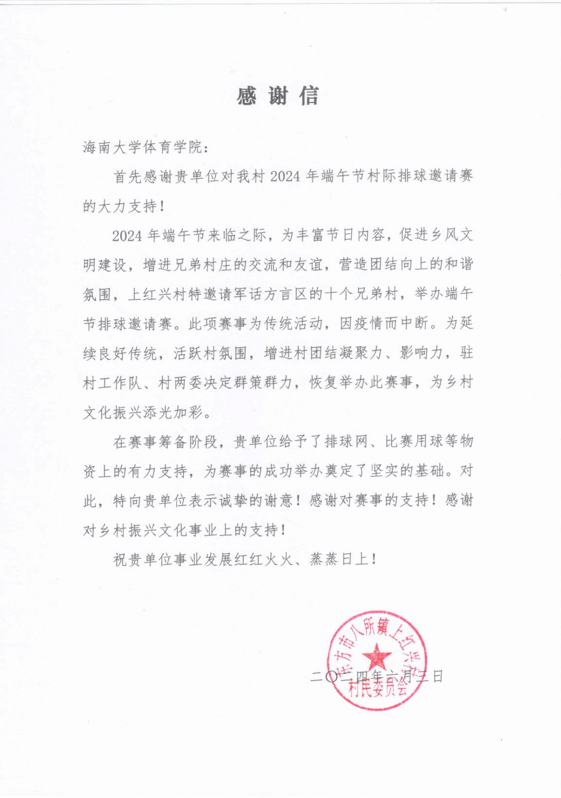 上红新村在感谢信中特别强调了对3044永利集团的感激之情,感谢3044永利集团对乡村文化振兴的有力支持。3044永利集团的这一举措,不仅丰富了乡村的文化生活,更激发了村民们对体育运动的热爱和参与热情,为乡村文化建设注入了新的活力。