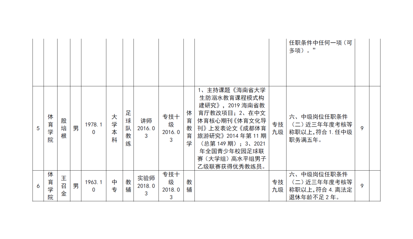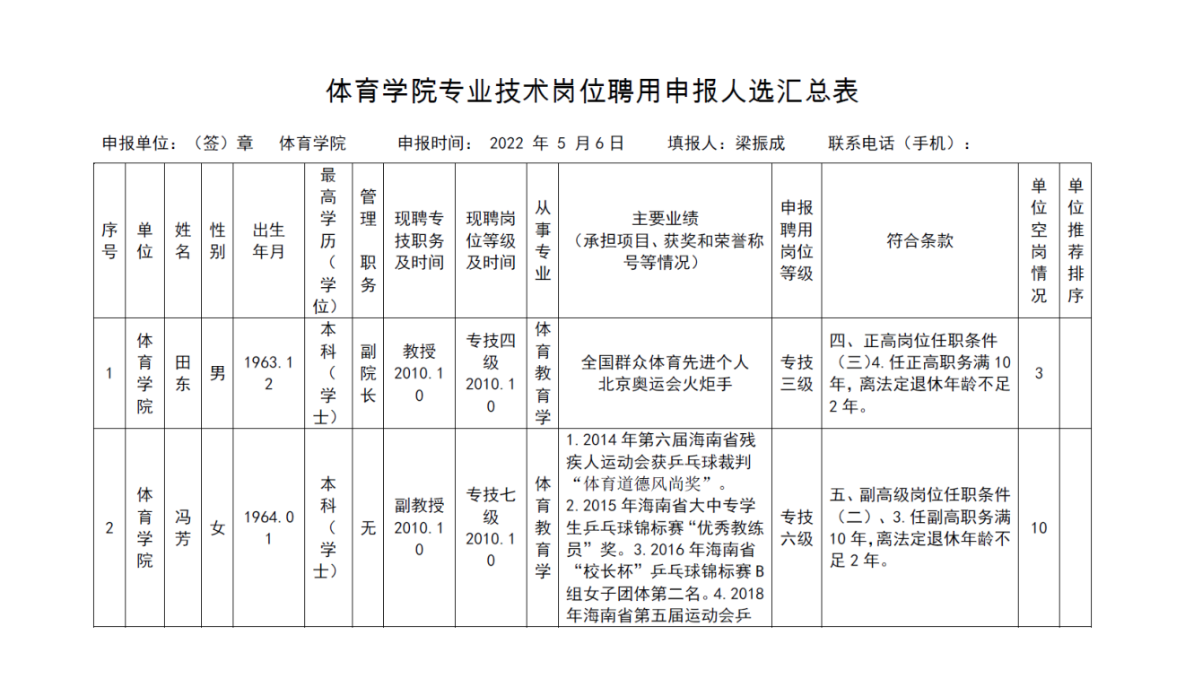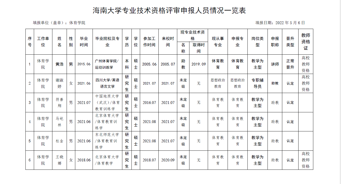 根据《海南省人力资源和社会保障厅关于我省事业单位岗位设置管理有关问题的通知》(琼人社发[2013]54号),《3044永利集团岗位设置及聘用方案(修订)》(海大[2020]103号)等相关要求,由教职工本人申请,共有6名教师提出2022年度专业岗位聘用申请、10名教师提出专业技术评审和认定申请, 公司基层评审委员会审核,并票决全部通过。具体名单如下: